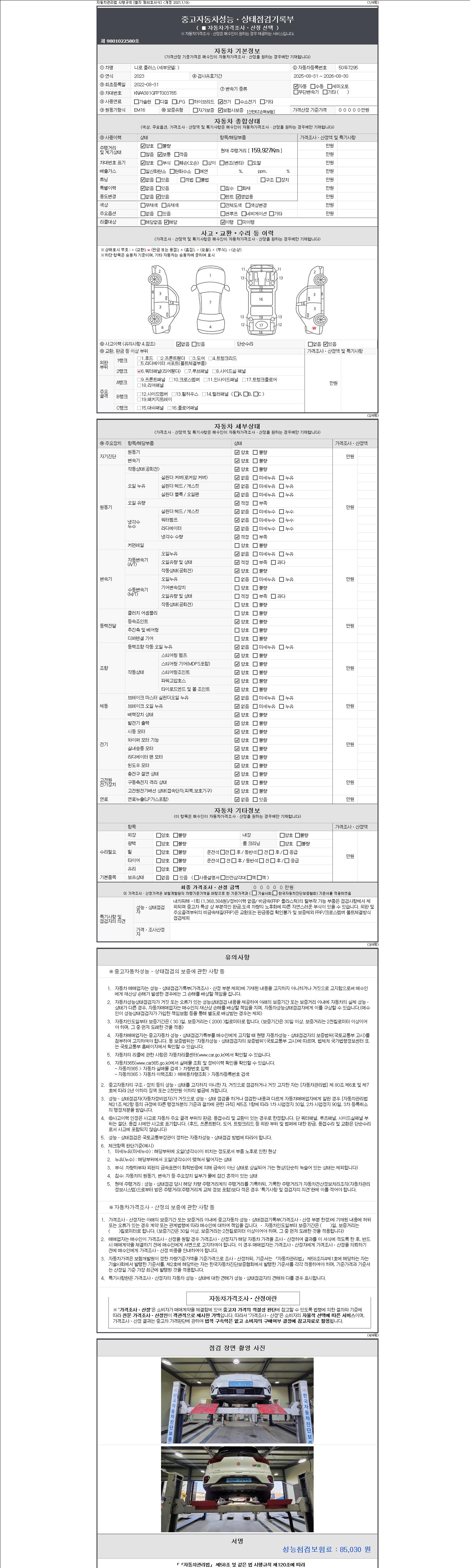 자동차관리법 시행규칙 제120조의 규정에 따라 별지 제 82호서식 《중고자동차 성능, 상태점검 기록부》를 발행한 성능, 상태점검자 및 매매자는 아래의 보증기간 또는 보증거리 이내의 중고자동차, 성능점검 기록부에 기재된 내용과 자동차의 실제 성능, 상태가 다른 경우 계약 또는 관계법령에 따라 매수인에 대하여 책임을 집니다.