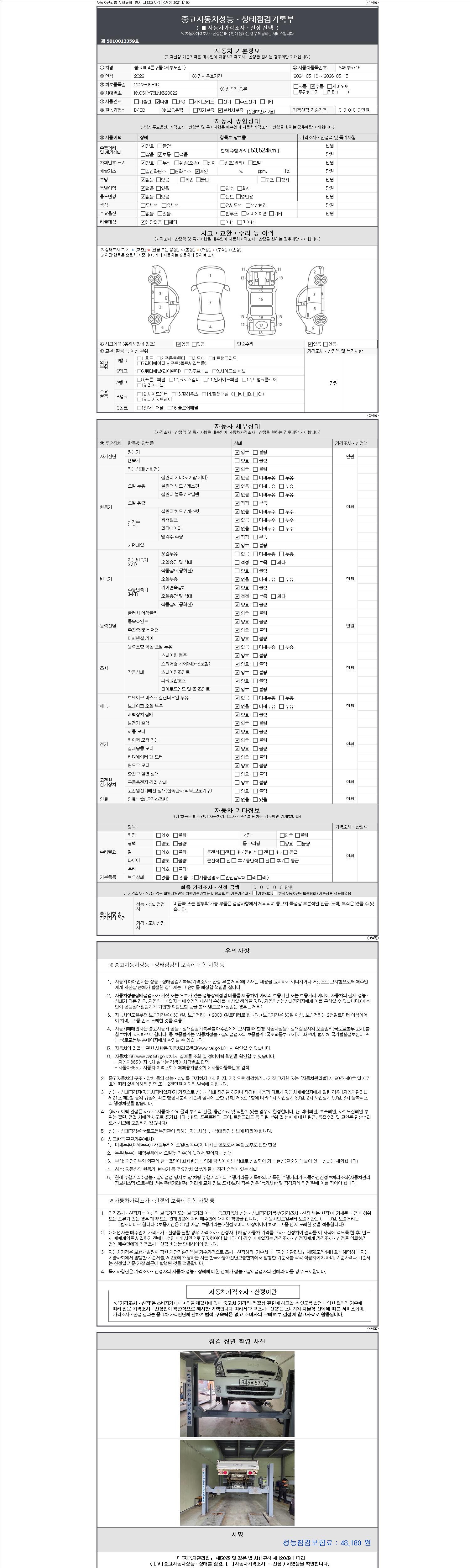 자동차관리법 시행규칙 제120조의 규정에 따라 별지 제 82호서식 《중고자동차 성능, 상태점검 기록부》를 발행한 성능, 상태점검자 및 매매자는 아래의 보증기간 또는 보증거리 이내의 중고자동차, 성능점검 기록부에 기재된 내용과 자동차의 실제 성능, 상태가 다른 경우 계약 또는 관계법령에 따라 매수인에 대하여 책임을 집니다.