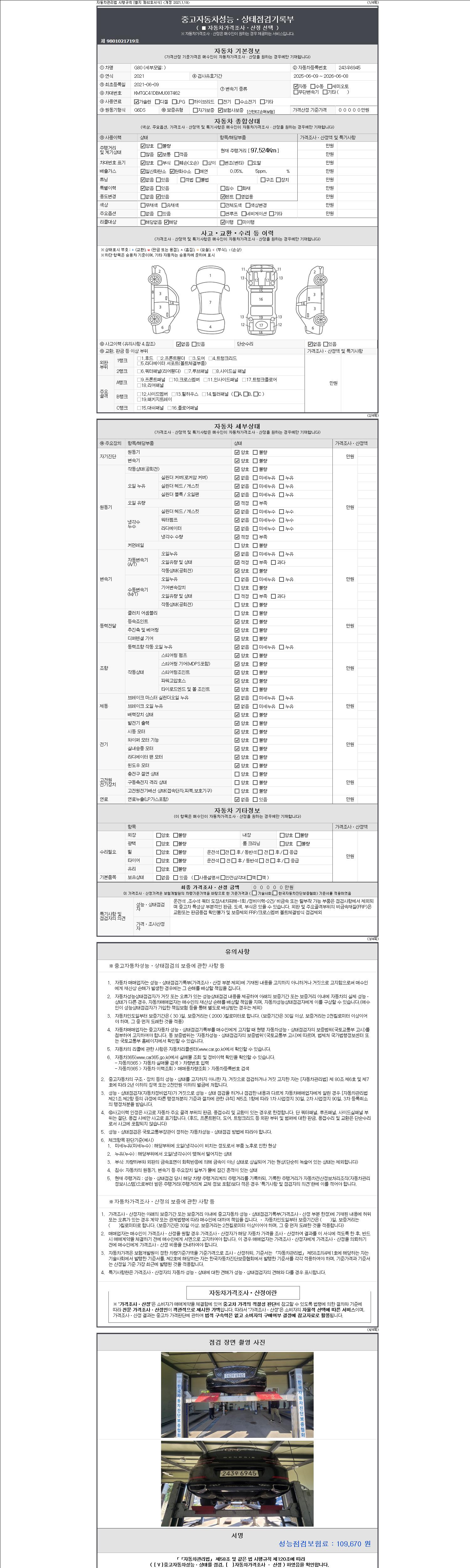 자동차관리법 시행규칙 제120조의 규정에 따라 별지 제 82호서식 《중고자동차 성능, 상태점검 기록부》를 발행한 성능, 상태점검자 및 매매자는 아래의 보증기간 또는 보증거리 이내의 중고자동차, 성능점검 기록부에 기재된 내용과 자동차의 실제 성능, 상태가 다른 경우 계약 또는 관계법령에 따라 매수인에 대하여 책임을 집니다.