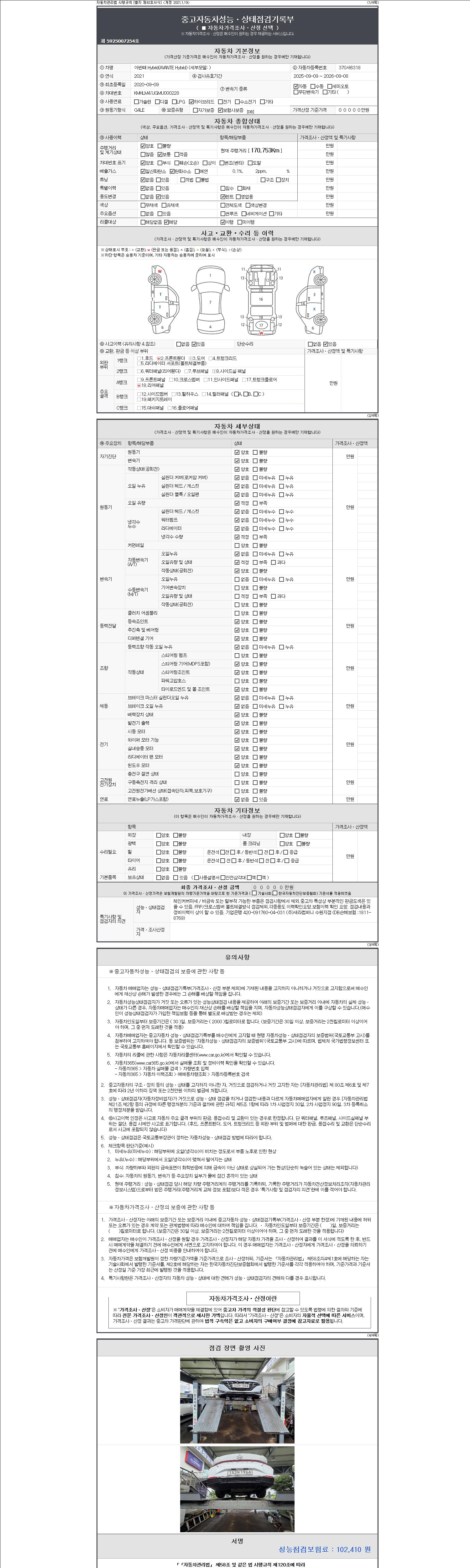 자동차관리법 시행규칙 제120조의 규정에 따라 별지 제 82호서식 《중고자동차 성능, 상태점검 기록부》를 발행한 성능, 상태점검자 및 매매자는 아래의 보증기간 또는 보증거리 이내의 중고자동차, 성능점검 기록부에 기재된 내용과 자동차의 실제 성능, 상태가 다른 경우 계약 또는 관계법령에 따라 매수인에 대하여 책임을 집니다.