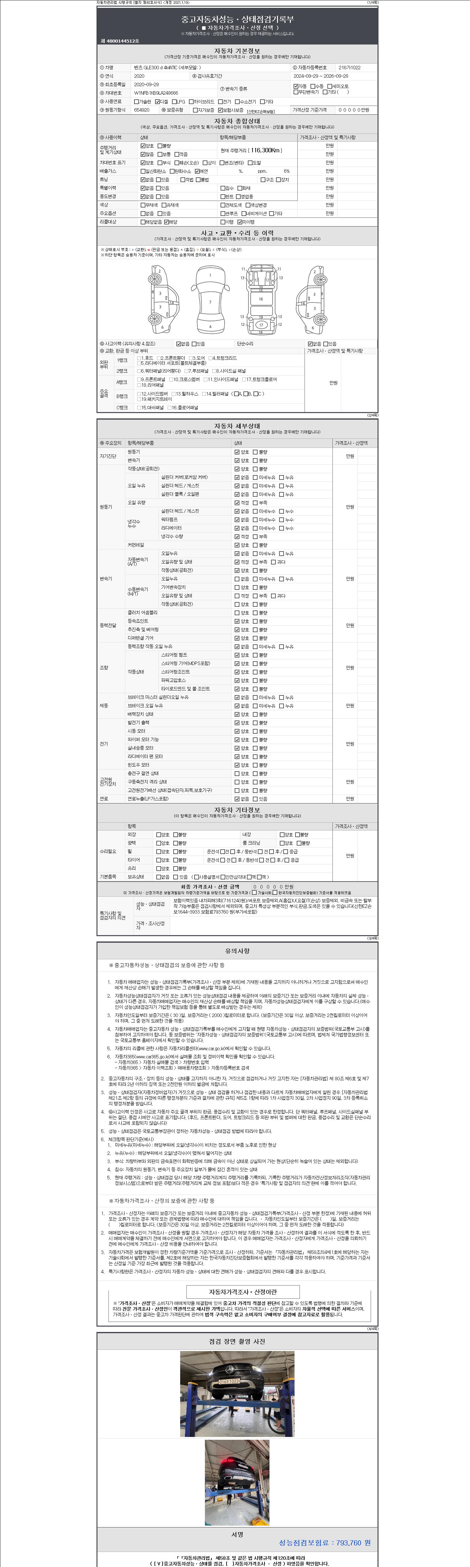 자동차관리법 시행규칙 제120조의 규정에 따라 별지 제 82호서식 《중고자동차 성능, 상태점검 기록부》를 발행한 성능, 상태점검자 및 매매자는 아래의 보증기간 또는 보증거리 이내의 중고자동차, 성능점검 기록부에 기재된 내용과 자동차의 실제 성능, 상태가 다른 경우 계약 또는 관계법령에 따라 매수인에 대하여 책임을 집니다.