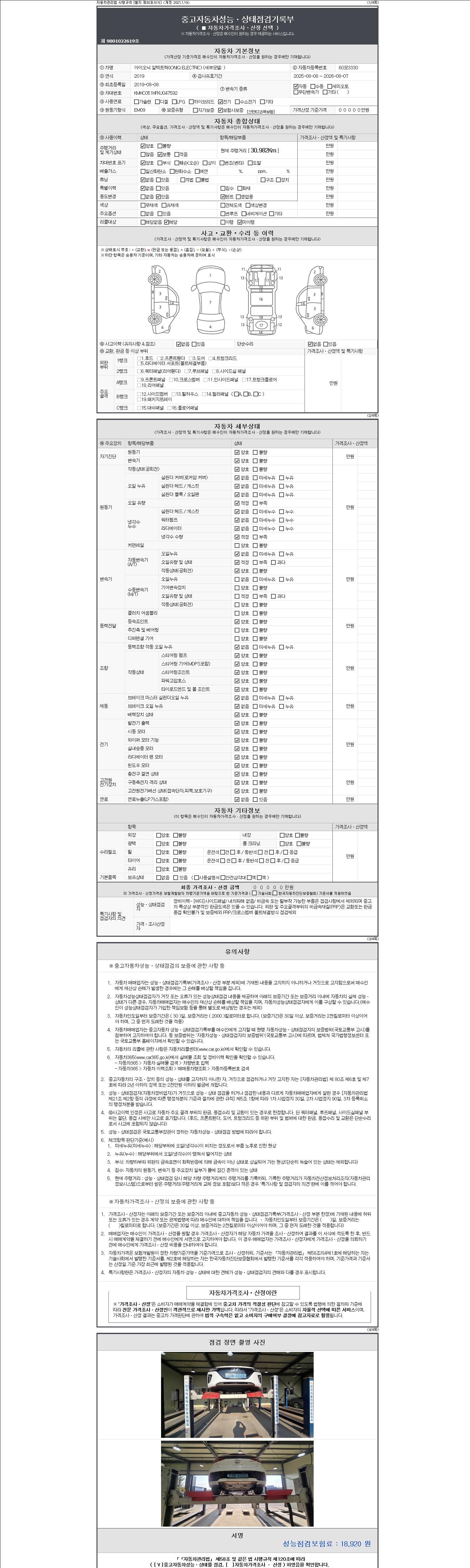자동차관리법 시행규칙 제120조의 규정에 따라 별지 제 82호서식 《중고자동차 성능, 상태점검 기록부》를 발행한 성능, 상태점검자 및 매매자는 아래의 보증기간 또는 보증거리 이내의 중고자동차, 성능점검 기록부에 기재된 내용과 자동차의 실제 성능, 상태가 다른 경우 계약 또는 관계법령에 따라 매수인에 대하여 책임을 집니다.