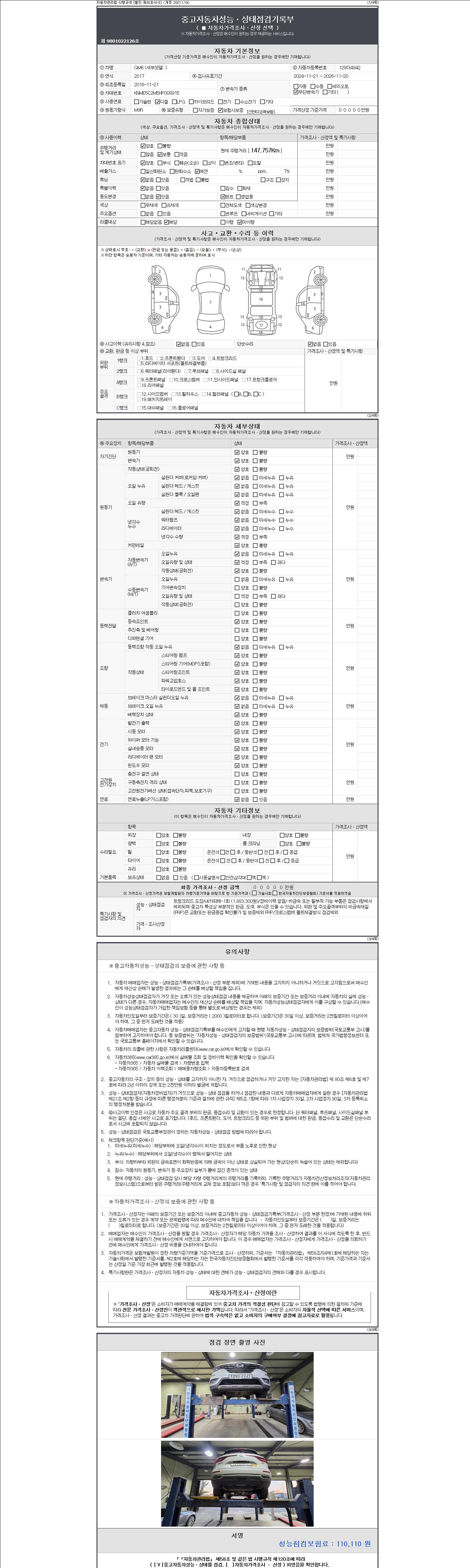 자동차관리법 시행규칙 제120조의 규정에 따라 별지 제 82호서식 《중고자동차 성능, 상태점검 기록부》를 발행한 성능, 상태점검자 및 매매자는 아래의 보증기간 또는 보증거리 이내의 중고자동차, 성능점검 기록부에 기재된 내용과 자동차의 실제 성능, 상태가 다른 경우 계약 또는 관계법령에 따라 매수인에 대하여 책임을 집니다.