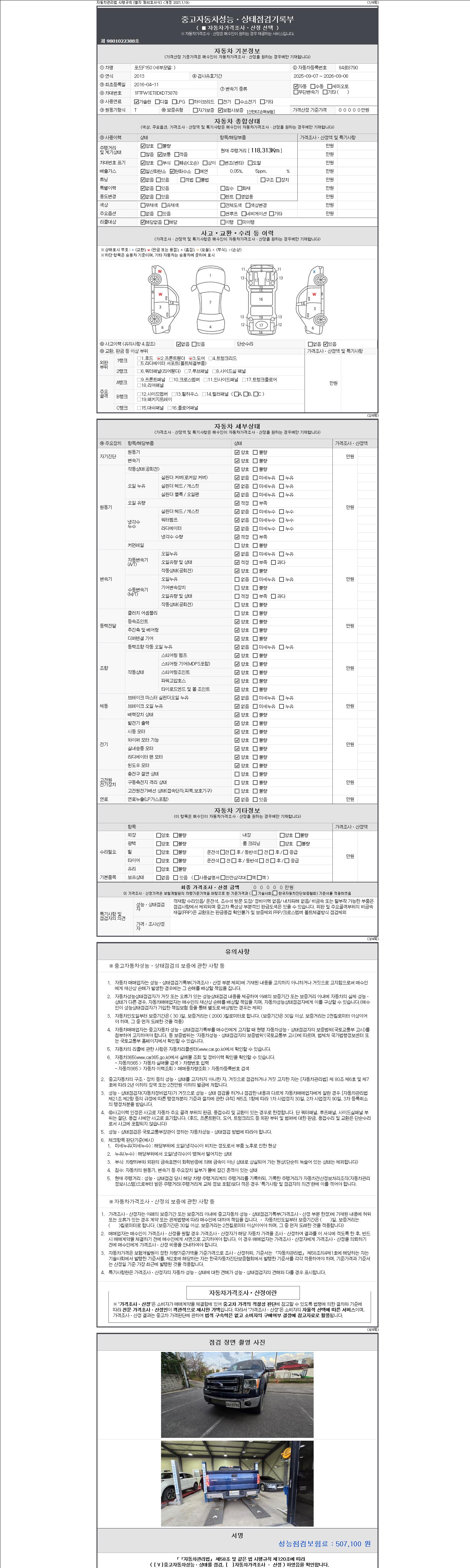자동차관리법 시행규칙 제120조의 규정에 따라 별지 제 82호서식 《중고자동차 성능, 상태점검 기록부》를 발행한 성능, 상태점검자 및 매매자는 아래의 보증기간 또는 보증거리 이내의 중고자동차, 성능점검 기록부에 기재된 내용과 자동차의 실제 성능, 상태가 다른 경우 계약 또는 관계법령에 따라 매수인에 대하여 책임을 집니다.