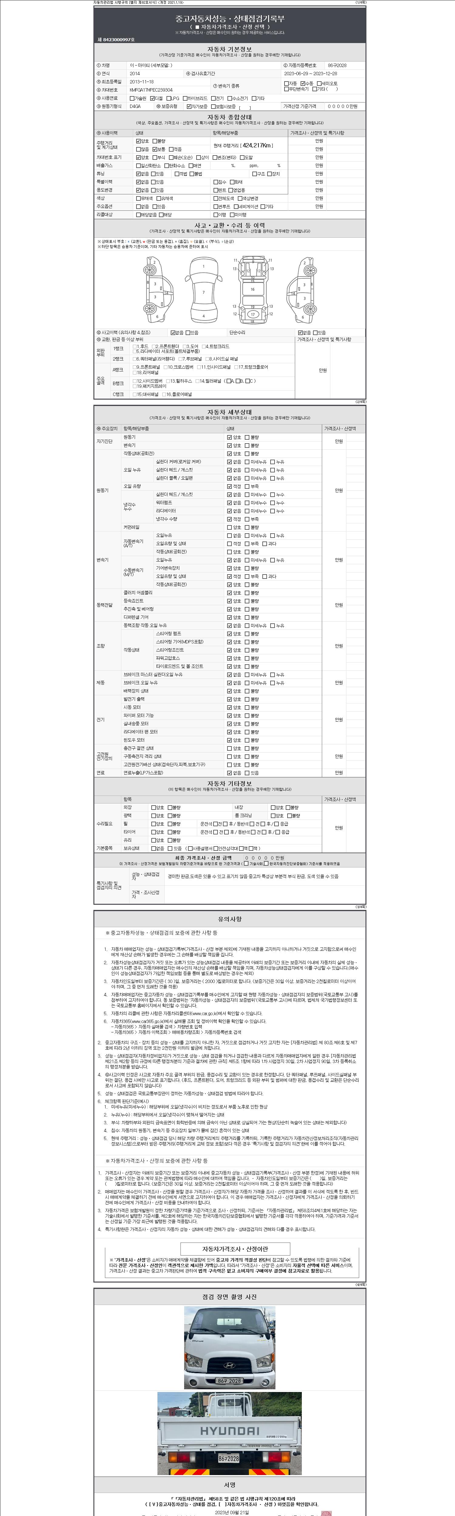 -중고자동차 매매업자를 통해 차량을 구입하실 경우 반드시 "중고자동차 성능, 상태점검 기록부"를 교뷰 받으셔야 하며, 매매업자는 반드시 의무 교부 하여야 압니다.