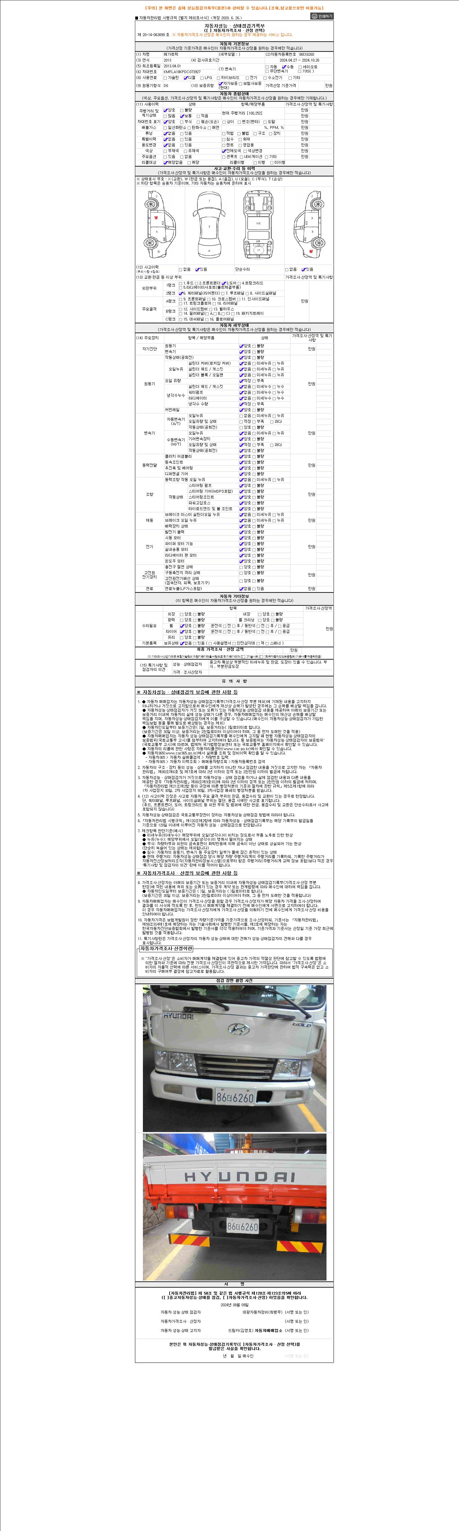 자동차관리법 시행규칙 제120조의 규정에 따라 별지 제 82호서식 《중고자동차 성능, 상태점검 기록부》를 발행한 성능, 상태점검자 및 매매자는 아래의 보증기간 또는 보증거리 이내의 중고자동차, 성능점검 기록부에 기재된 내용과 자동차의 실제 성능, 상태가 다른 경우 계약 또는 관계법령에 따라 매수인에 대하여 책임을 집니다.