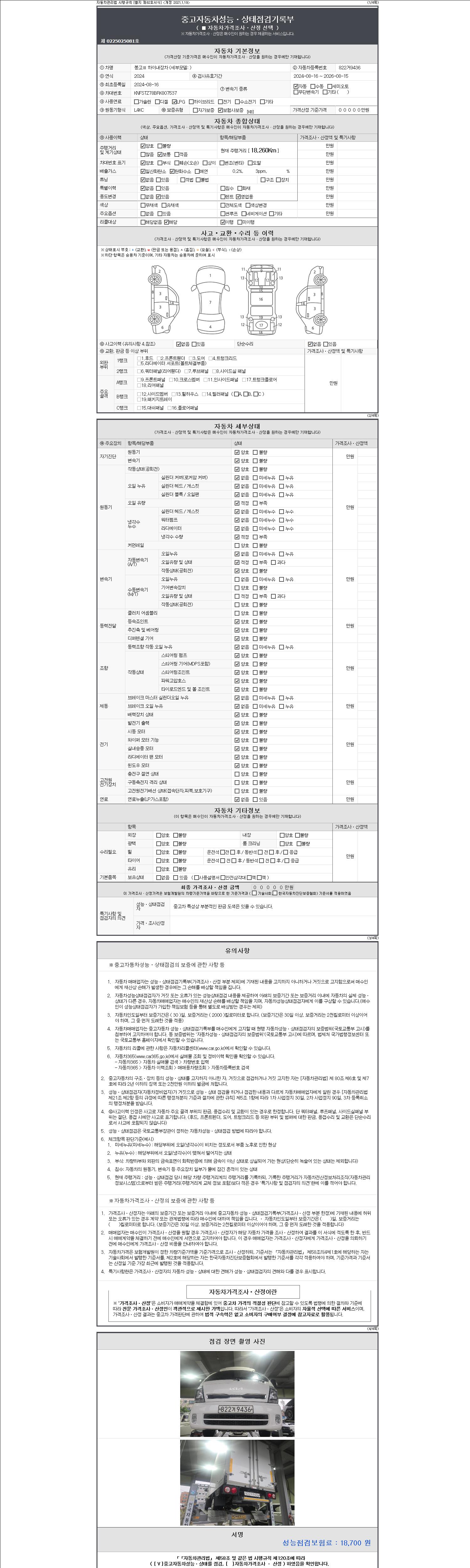 자동차관리법 시행규칙 제120조의 규정에 따라 별지 제 82호서식 《중고자동차 성능, 상태점검 기록부》를 발행한 성능, 상태점검자 및 매매자는 아래의 보증기간 또는 보증거리 이내의 중고자동차, 성능점검 기록부에 기재된 내용과 자동차의 실제 성능, 상태가 다른 경우 계약 또는 관계법령에 따라 매수인에 대하여 책임을 집니다.