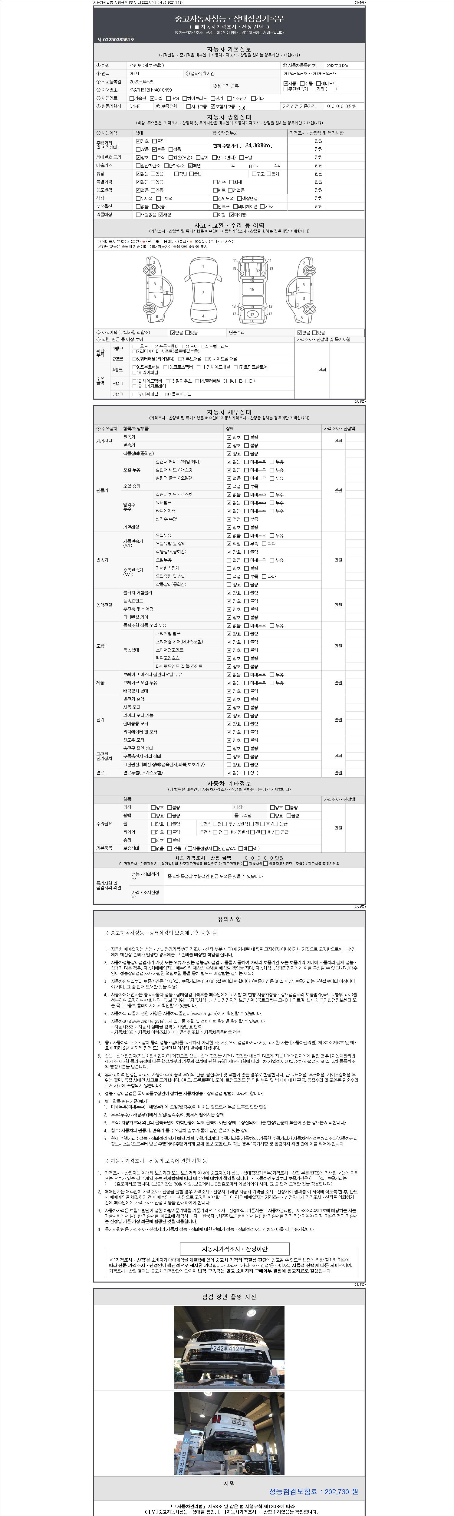 자동차관리법 시행규칙 제120조의 규정에 따라 별지 제 82호서식 《중고자동차 성능, 상태점검 기록부》를 발행한 성능, 상태점검자 및 매매자는 아래의 보증기간 또는 보증거리 이내의 중고자동차, 성능점검 기록부에 기재된 내용과 자동차의 실제 성능, 상태가 다른 경우 계약 또는 관계법령에 따라 매수인에 대하여 책임을 집니다.