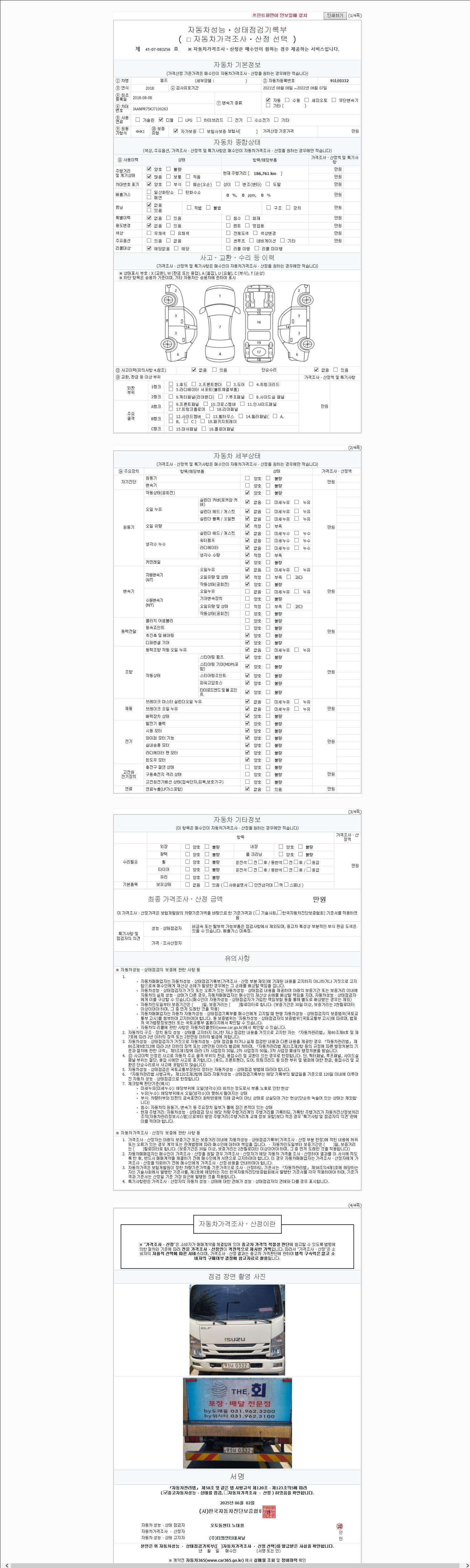 | 주행거리 | 186,761 km | 차량번호 | 91너0332 |