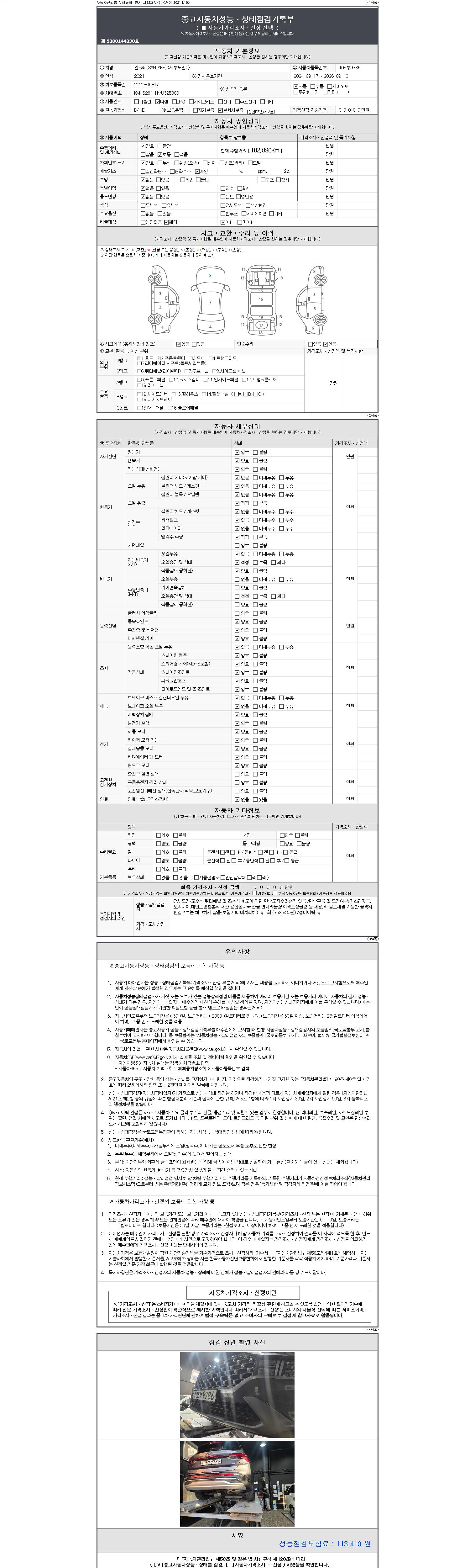 자동차관리법 시행규칙 제120조의 규정에 따라 별지 제 82호서식 《중고자동차 성능, 상태점검 기록부》를 발행한 성능, 상태점검자 및 매매자는 아래의 보증기간 또는 보증거리 이내의 중고자동차, 성능점검 기록부에 기재된 내용과 자동차의 실제 성능, 상태가 다른 경우 계약 또는 관계법령에 따라 매수인에 대하여 책임을 집니다.