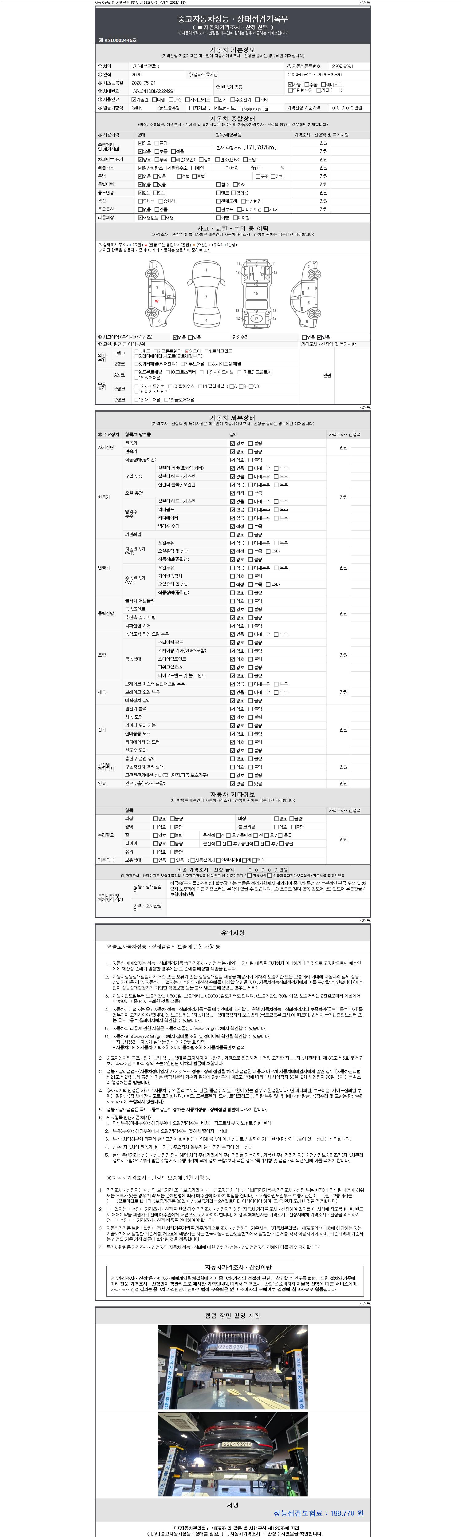 자동차관리법 시행규칙 제120조의 규정에 따라 별지 제 82호서식 《중고자동차 성능, 상태점검 기록부》를 발행한 성능, 상태점검자 및 매매자는 아래의 보증기간 또는 보증거리 이내의 중고자동차, 성능점검 기록부에 기재된 내용과 자동차의 실제 성능, 상태가 다른 경우 계약 또는 관계법령에 따라 매수인에 대하여 책임을 집니다.