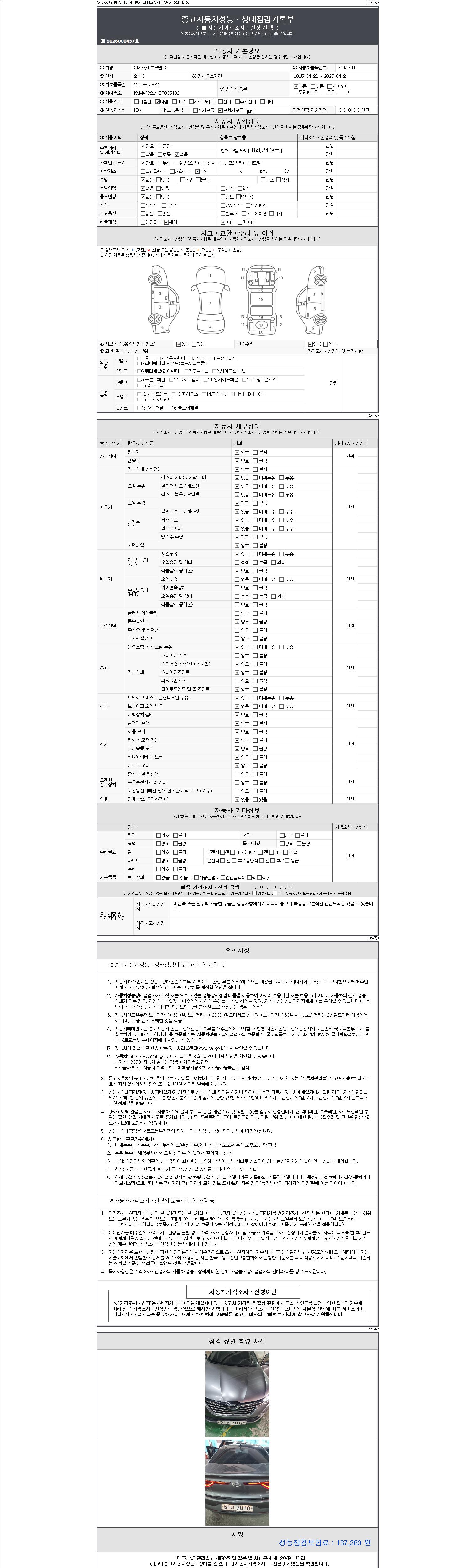 -중고자동차 매매업자를 통해 차량을 구입하실 경우 반드시 "중고자동차 성능, 상태점검 기록부"를 교뷰 받으셔야 하며, 매매업자는 반드시 의무 교부 하여야 압니다.