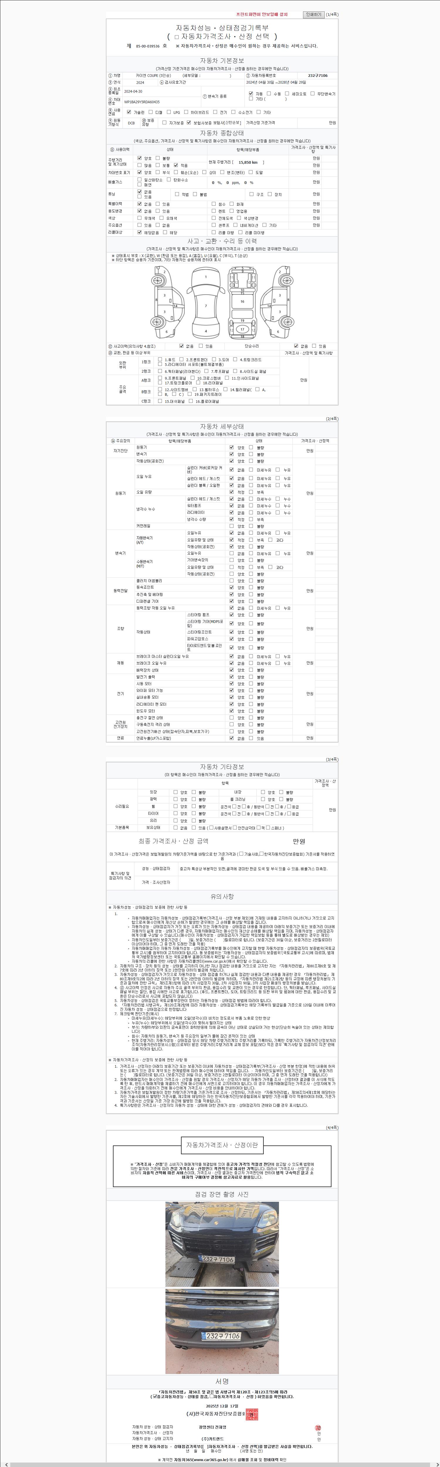 | 주행거리 | 15,850 km | 차량번호 | 232구7106 |