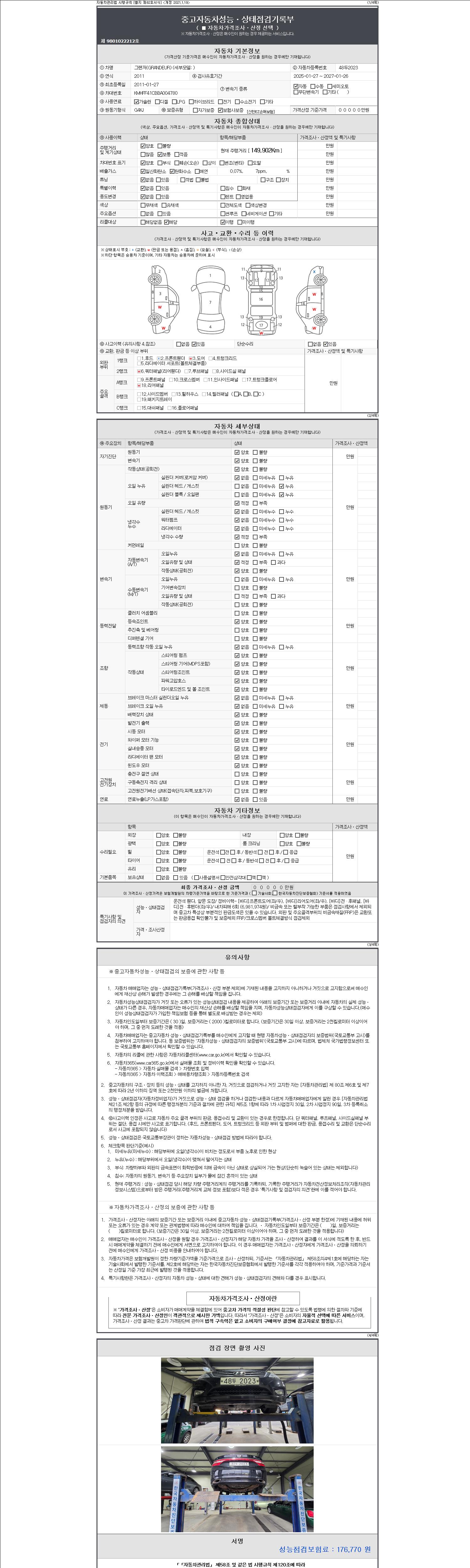 자동차관리법 시행규칙 제120조의 규정에 따라 별지 제 82호서식 《중고자동차 성능, 상태점검 기록부》를 발행한 성능, 상태점검자 및 매매자는 아래의 보증기간 또는 보증거리 이내의 중고자동차, 성능점검 기록부에 기재된 내용과 자동차의 실제 성능, 상태가 다른 경우 계약 또는 관계법령에 따라 매수인에 대하여 책임을 집니다.