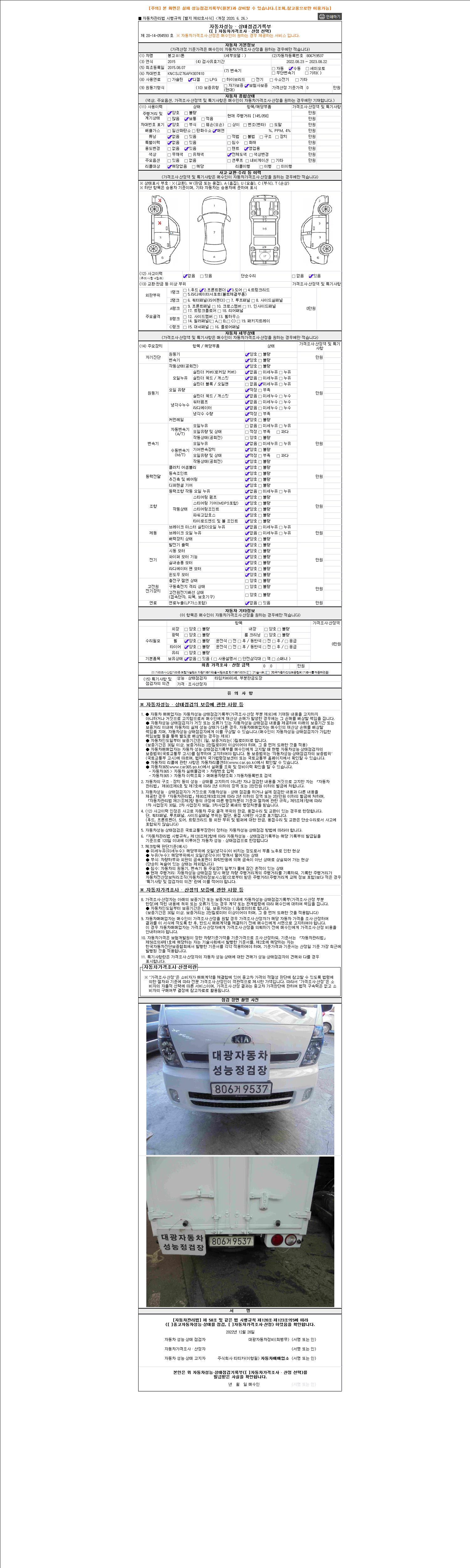 자동차관리법 시행규칙 제120조의 규정에 따라 별지 제 82호서식 《중고자동차 성능, 상태점검 기록부》를 발행한 성능, 상태점검자 및 매매자는 아래의 보증기간 또는 보증거리 이내의 중고자동차, 성능점검 기록부에 기재된 내용과 자동차의 실제 성능, 상태가 다른 경우 계약 또는 관계법령에 따라 매수인에 대하여 책임을 집니다.