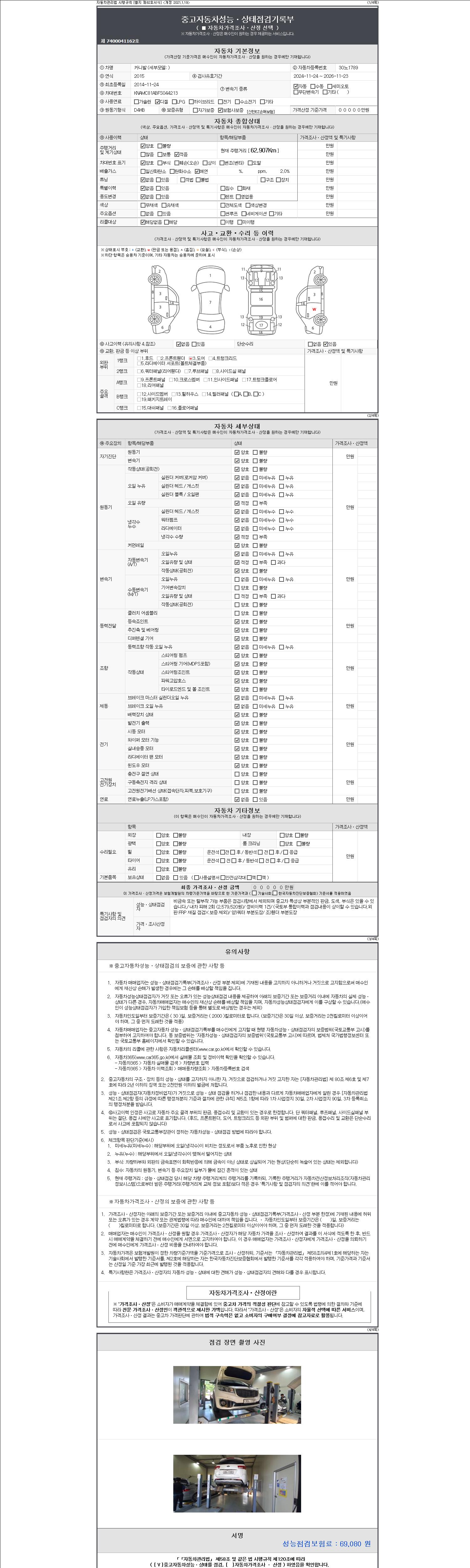 자동차관리법 시행규칙 제120조의 규정에 따라 별지 제 82호서식 《중고자동차 성능, 상태점검 기록부》를 발행한 성능, 상태점검자 및 매매자는 아래의 보증기간 또는 보증거리 이내의 중고자동차, 성능점검 기록부에 기재된 내용과 자동차의 실제 성능, 상태가 다른 경우 계약 또는 관계법령에 따라 매수인에 대하여 책임을 집니다.