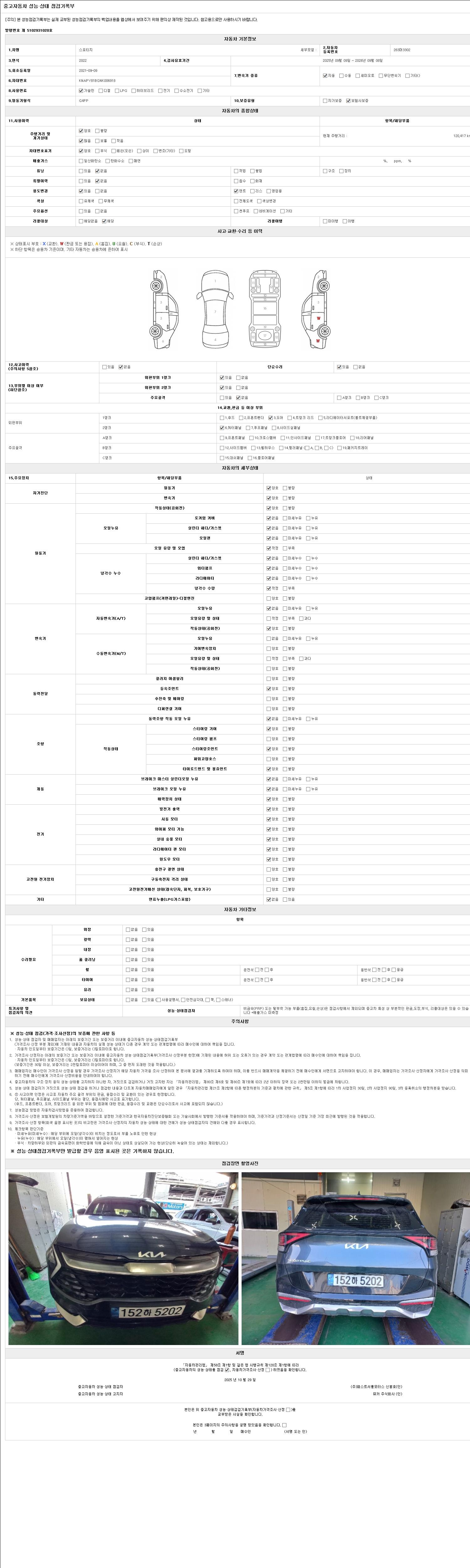 자동차관리법 시행규칙 제120조의 규정에 따라 별지 제 82호서식 《중고자동차 성능, 상태점검 기록부》를 발행한 성능, 상태점검자 및 매매자는 아래의 보증기간 또는 보증거리 이내의 중고자동차, 성능점검 기록부에 기재된 내용과 자동차의 실제 성능, 상태가 다른 경우 계약 또는 관계법령에 따라 매수인에 대하여 책임을 집니다.