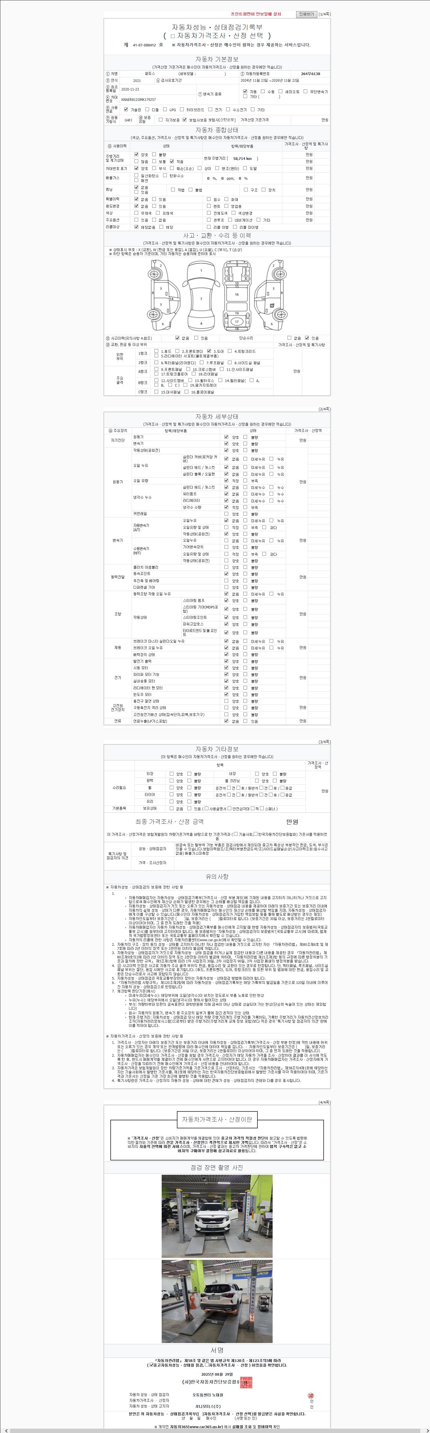 자동차관리법 시행규칙 제120조의 규정에 따라 별지 제 82호서식 《중고자동차 성능, 상태점검 기록부》를 발행한 성능, 상태점검자 및 매매자는 아래의 보증기간 또는 보증거리 이내의 중고자동차, 성능점검 기록부에 기재된 내용과 자동차의 실제 성능, 상태가 다른 경우 계약 또는 관계법령에 따라 매수인에 대하여 책임을 집니다.
