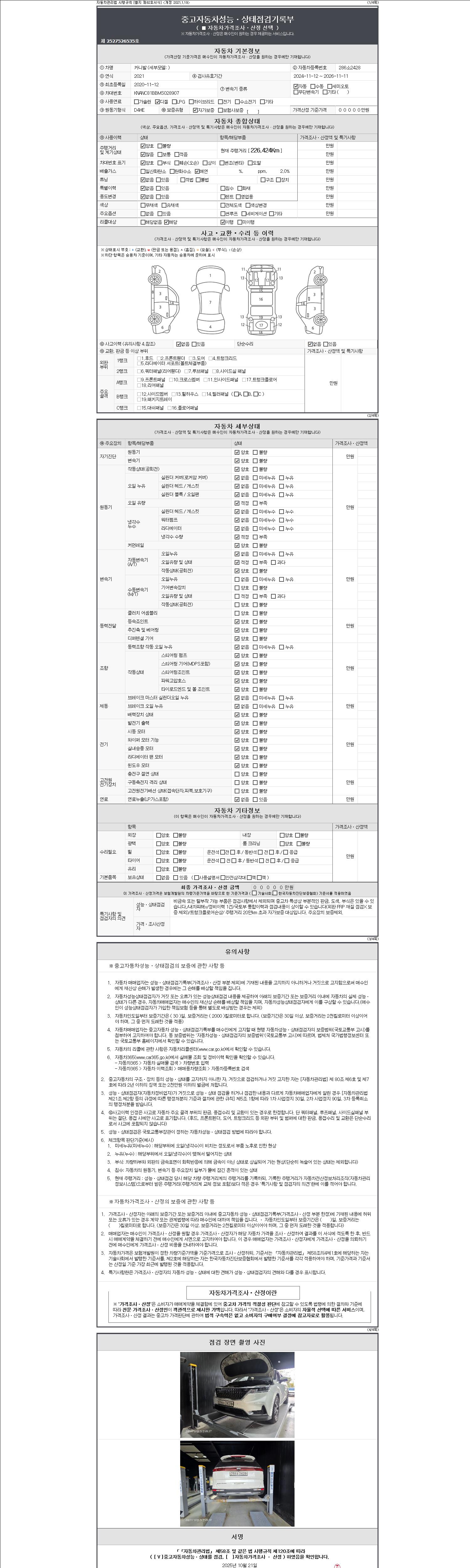 자동차관리법 시행규칙 제120조의 규정에 따라 별지 제 82호서식 《중고자동차 성능, 상태점검 기록부》를 발행한 성능, 상태점검자 및 매매자는 아래의 보증기간 또는 보증거리 이내의 중고자동차, 성능점검 기록부에 기재된 내용과 자동차의 실제 성능, 상태가 다른 경우 계약 또는 관계법령에 따라 매수인에 대하여 책임을 집니다.