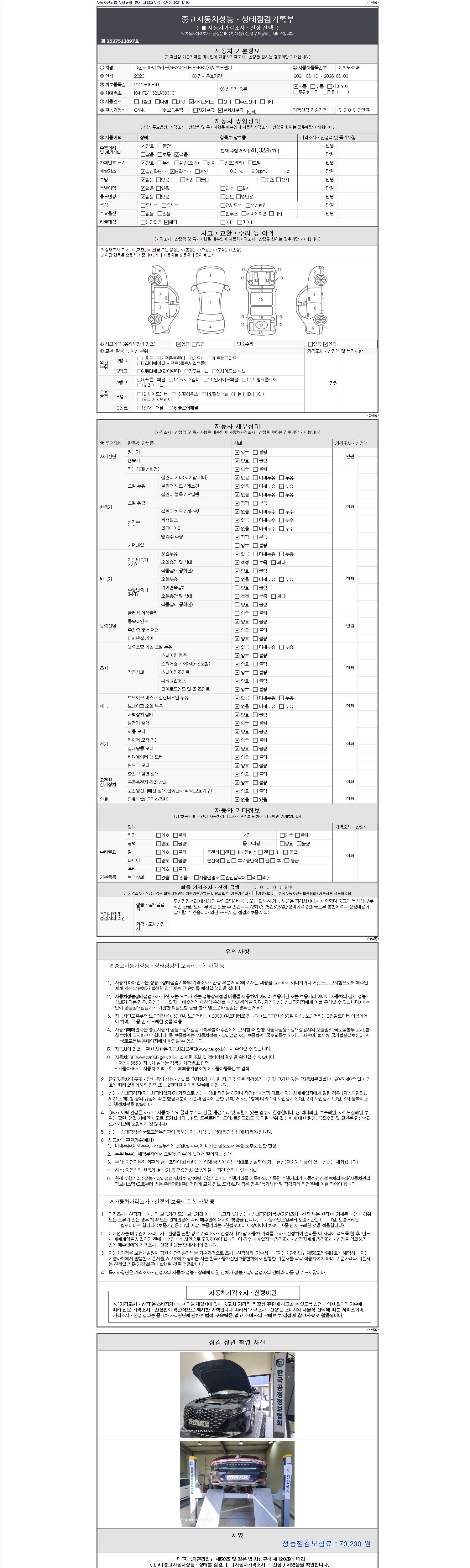 자동차관리법 시행규칙 제120조의 규정에 따라 별지 제 82호서식 《중고자동차 성능, 상태점검 기록부》를 발행한 성능, 상태점검자 및 매매자는 아래의 보증기간 또는 보증거리 이내의 중고자동차, 성능점검 기록부에 기재된 내용과 자동차의 실제 성능, 상태가 다른 경우 계약 또는 관계법령에 따라 매수인에 대하여 책임을 집니다.