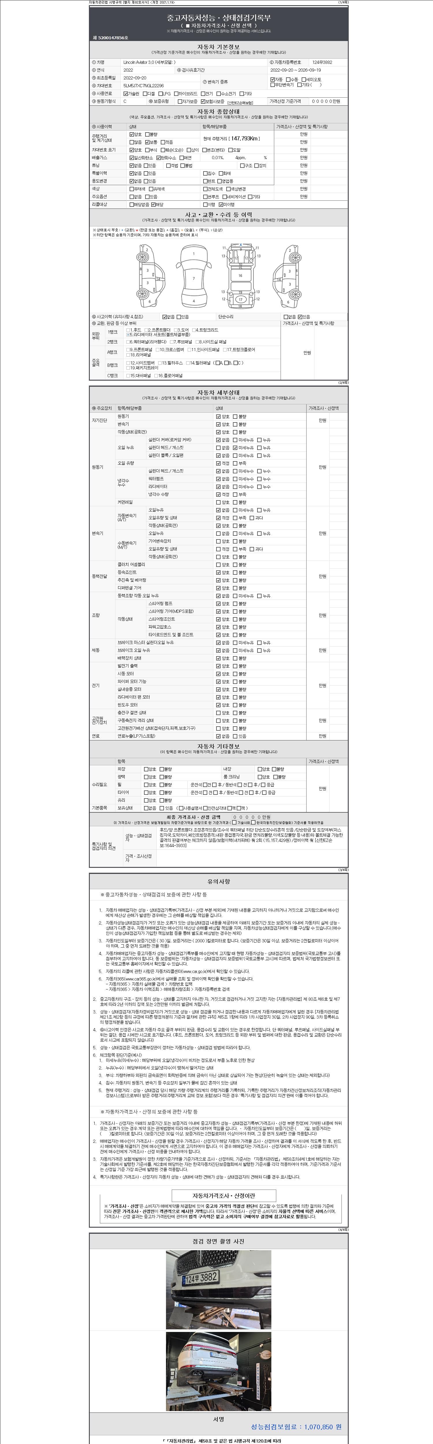 자동차관리법 시행규칙 제120조의 규정에 따라 별지 제 82호서식 《중고자동차 성능, 상태점검 기록부》를 발행한 성능, 상태점검자 및 매매자는 아래의 보증기간 또는 보증거리 이내의 중고자동차, 성능점검 기록부에 기재된 내용과 자동차의 실제 성능, 상태가 다른 경우 계약 또는 관계법령에 따라 매수인에 대하여 책임을 집니다.