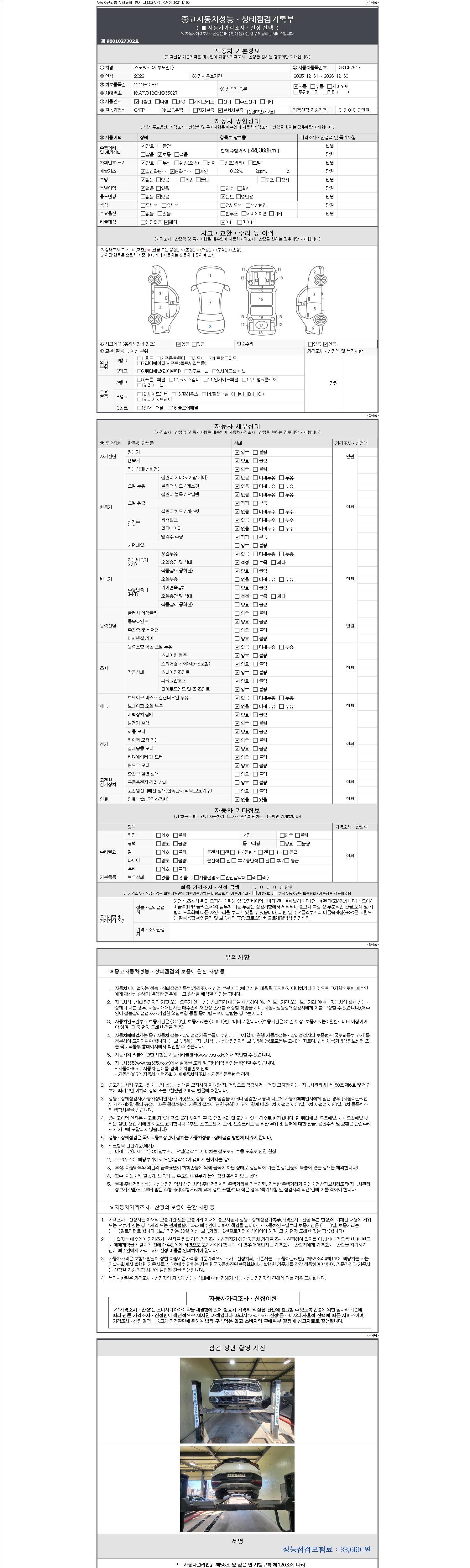 자동차관리법 시행규칙 제120조의 규정에 따라 별지 제 82호서식 《중고자동차 성능, 상태점검 기록부》를 발행한 성능, 상태점검자 및 매매자는 아래의 보증기간 또는 보증거리 이내의 중고자동차, 성능점검 기록부에 기재된 내용과 자동차의 실제 성능, 상태가 다른 경우 계약 또는 관계법령에 따라 매수인에 대하여 책임을 집니다.