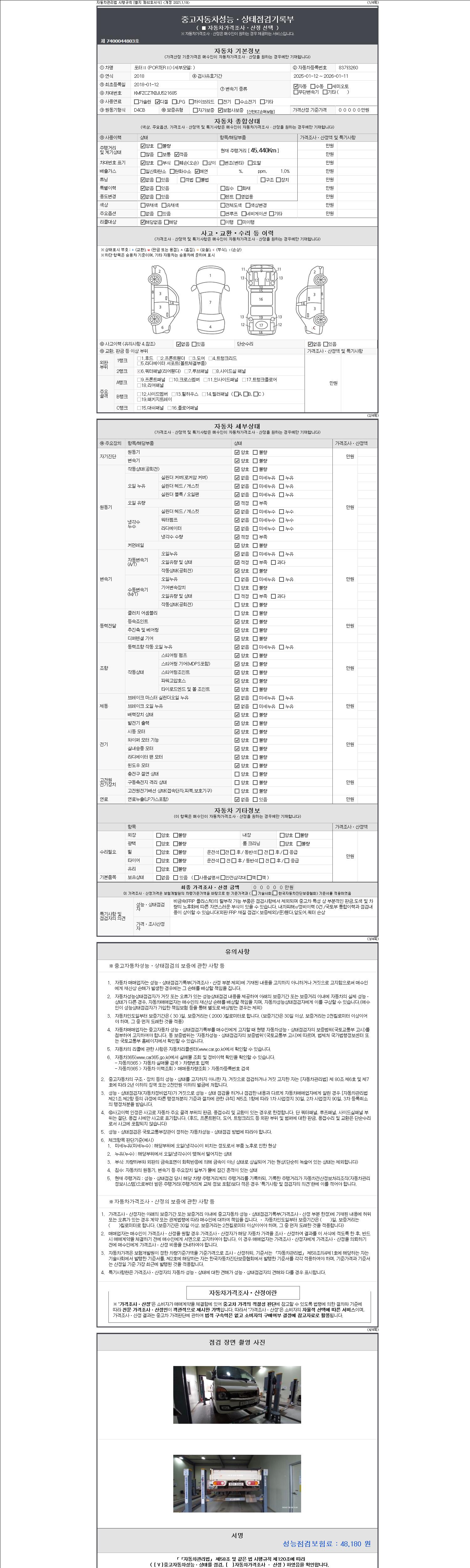 자동차관리법 시행규칙 제120조의 규정에 따라 별지 제 82호서식 《중고자동차 성능, 상태점검 기록부》를 발행한 성능, 상태점검자 및 매매자는 아래의 보증기간 또는 보증거리 이내의 중고자동차, 성능점검 기록부에 기재된 내용과 자동차의 실제 성능, 상태가 다른 경우 계약 또는 관계법령에 따라 매수인에 대하여 책임을 집니다.