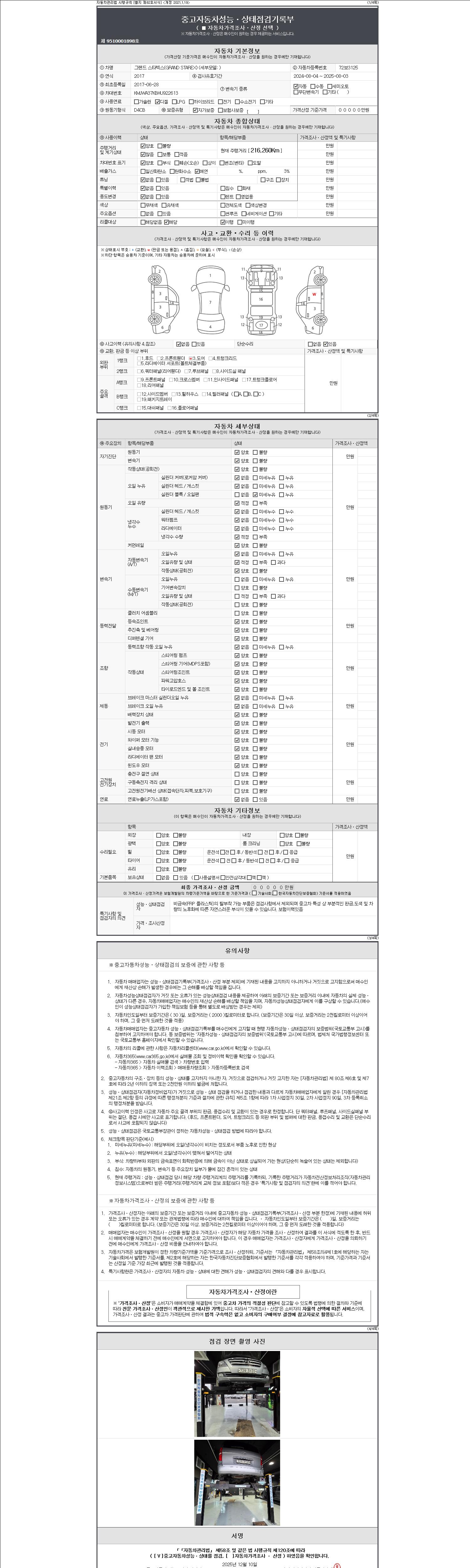 자동차관리법 시행규칙 제120조의 규정에 따라 별지 제 82호서식 《중고자동차 성능, 상태점검 기록부》를 발행한 성능, 상태점검자 및 매매자는 아래의 보증기간 또는 보증거리 이내의 중고자동차, 성능점검 기록부에 기재된 내용과 자동차의 실제 성능, 상태가 다른 경우 계약 또는 관계법령에 따라 매수인에 대하여 책임을 집니다.