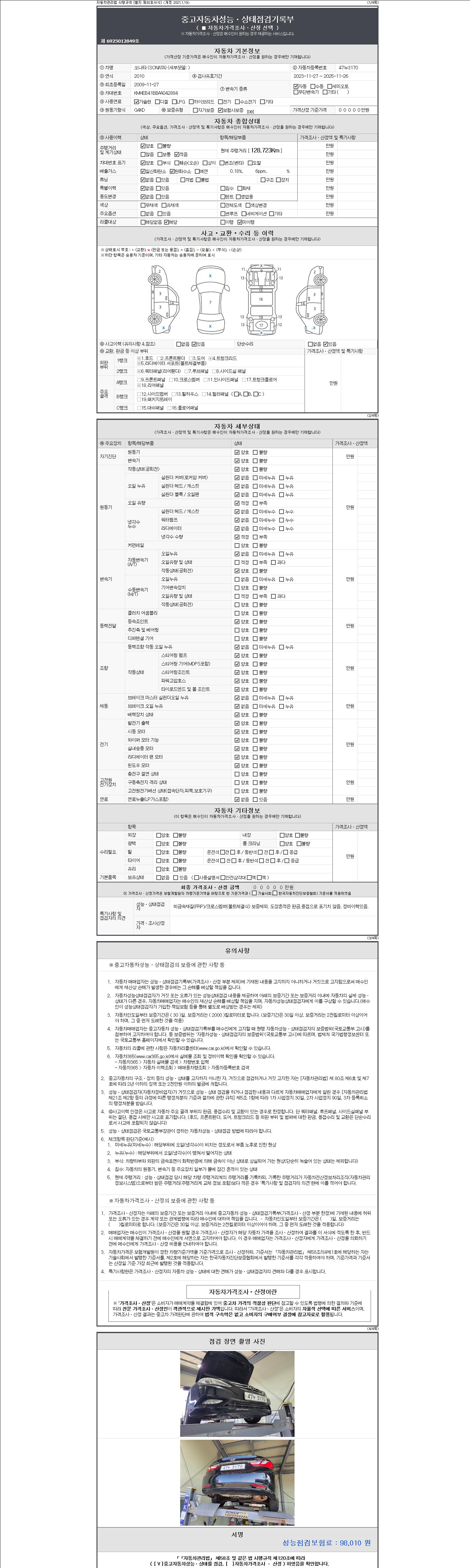 -중고자동차 매매업자를 통해 차량을 구입하실 경우 반드시 "중고자동차 성능, 상태점검 기록부"를 교뷰 받으셔야 하며, 매매업자는 반드시 의무 교부 하여야 압니다.