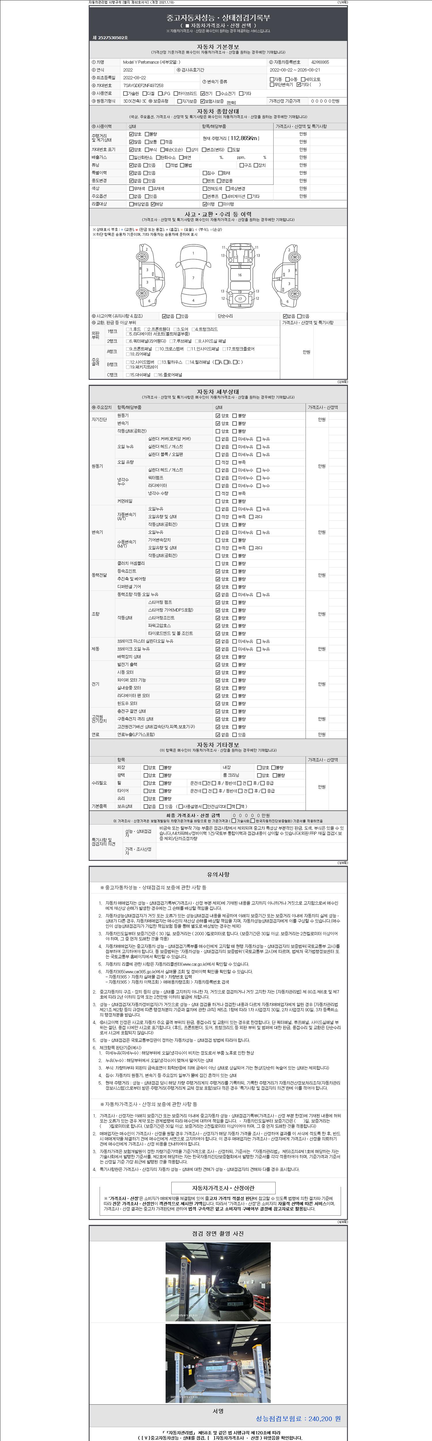 자동차관리법 시행규칙 제120조의 규정에 따라 별지 제 82호서식 《중고자동차 성능, 상태점검 기록부》를 발행한 성능, 상태점검자 및 매매자는 아래의 보증기간 또는 보증거리 이내의 중고자동차, 성능점검 기록부에 기재된 내용과 자동차의 실제 성능, 상태가 다른 경우 계약 또는 관계법령에 따라 매수인에 대하여 책임을 집니다.