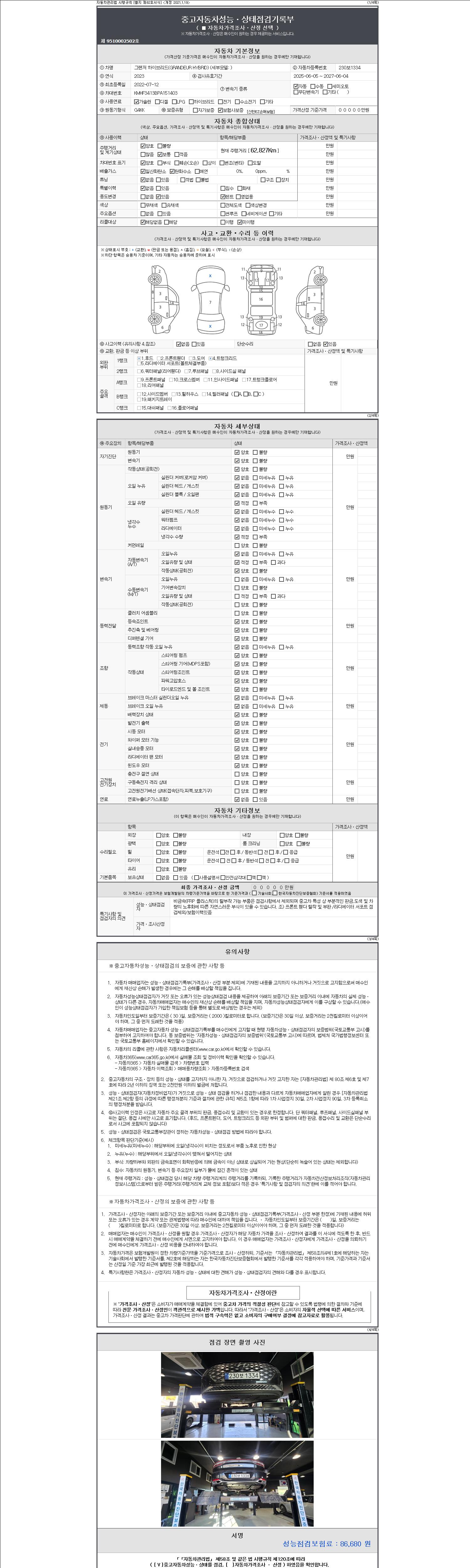 자동차관리법 시행규칙 제120조의 규정에 따라 별지 제 82호서식 《중고자동차 성능, 상태점검 기록부》를 발행한 성능, 상태점검자 및 매매자는 아래의 보증기간 또는 보증거리 이내의 중고자동차, 성능점검 기록부에 기재된 내용과 자동차의 실제 성능, 상태가 다른 경우 계약 또는 관계법령에 따라 매수인에 대하여 책임을 집니다.
