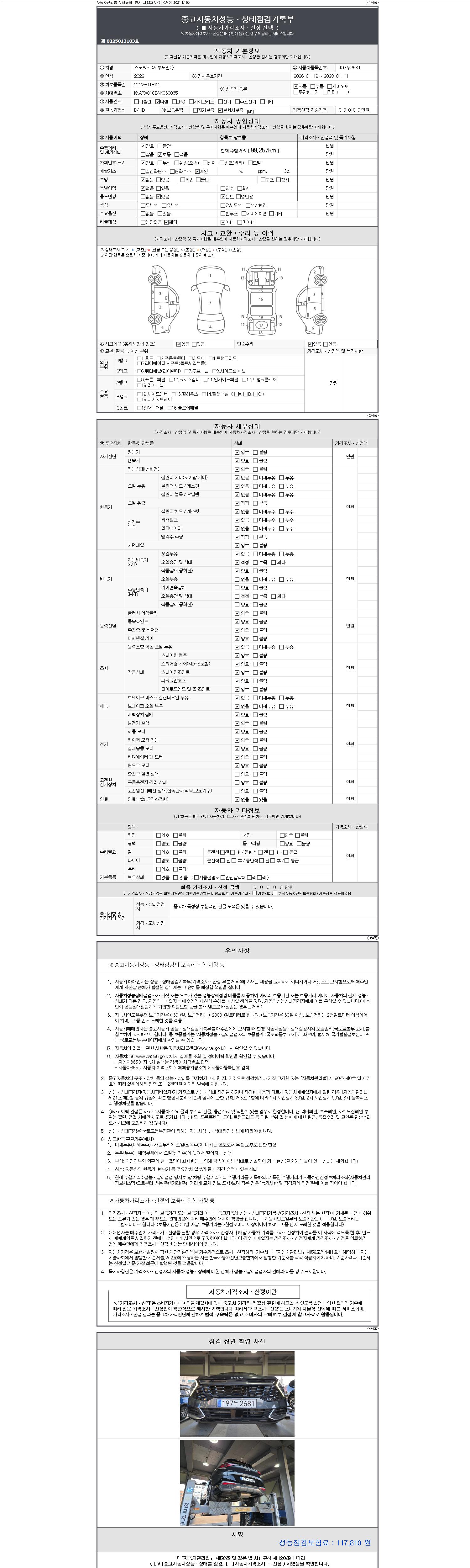 자동차관리법 시행규칙 제120조의 규정에 따라 별지 제 82호서식 《중고자동차 성능, 상태점검 기록부》를 발행한 성능, 상태점검자 및 매매자는 아래의 보증기간 또는 보증거리 이내의 중고자동차, 성능점검 기록부에 기재된 내용과 자동차의 실제 성능, 상태가 다른 경우 계약 또는 관계법령에 따라 매수인에 대하여 책임을 집니다.