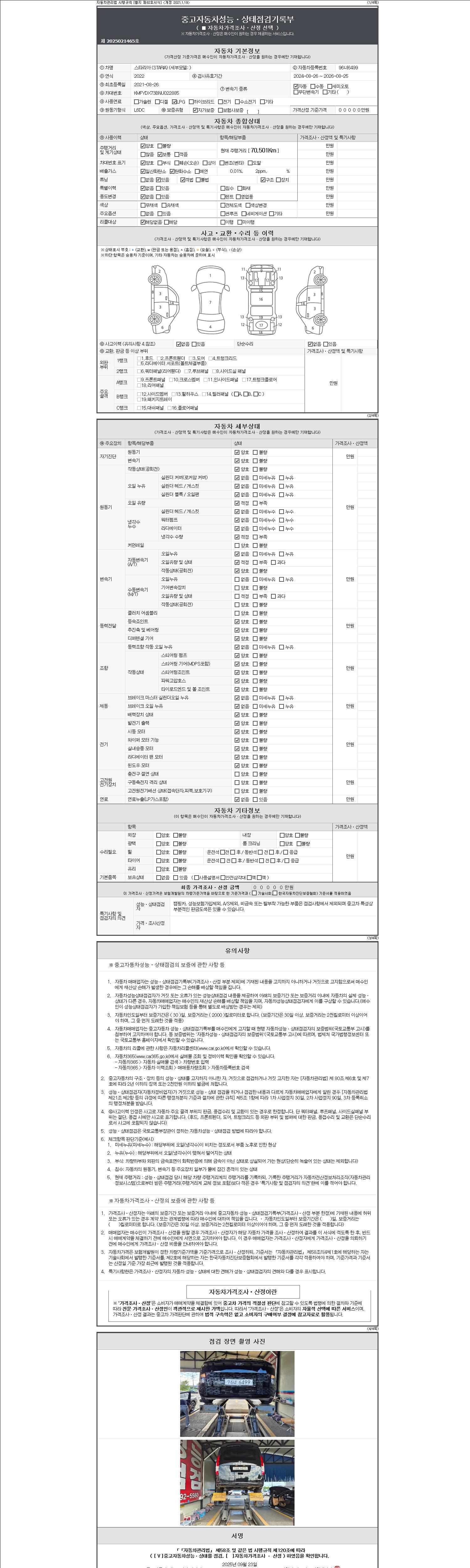 -중고자동차 매매업자를 통해 차량을 구입하실 경우 반드시 "중고자동차 성능, 상태점검 기록부"를 교뷰 받으셔야 하며, 매매업자는 반드시 의무 교부 하여야 압니다.