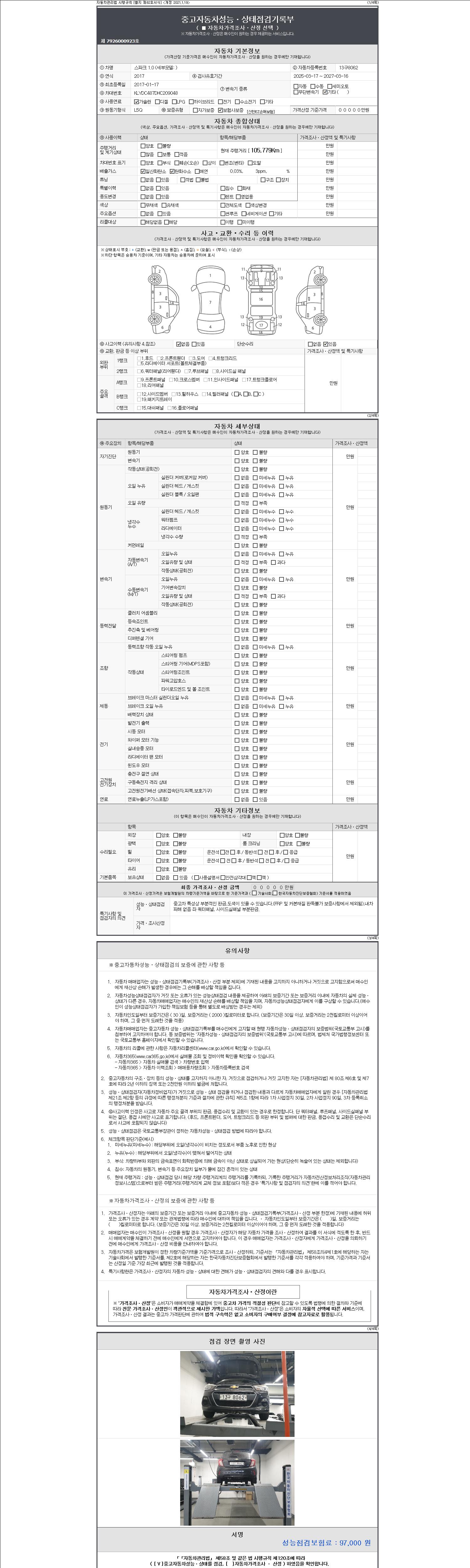 자동차관리법 시행규칙 제120조의 규정에 따라 별지 제 82호서식 《중고자동차 성능, 상태점검 기록부》를 발행한 성능, 상태점검자 및 매매자는 아래의 보증기간 또는 보증거리 이내의 중고자동차, 성능점검 기록부에 기재된 내용과 자동차의 실제 성능, 상태가 다른 경우 계약 또는 관계법령에 따라 매수인에 대하여 책임을 집니다.