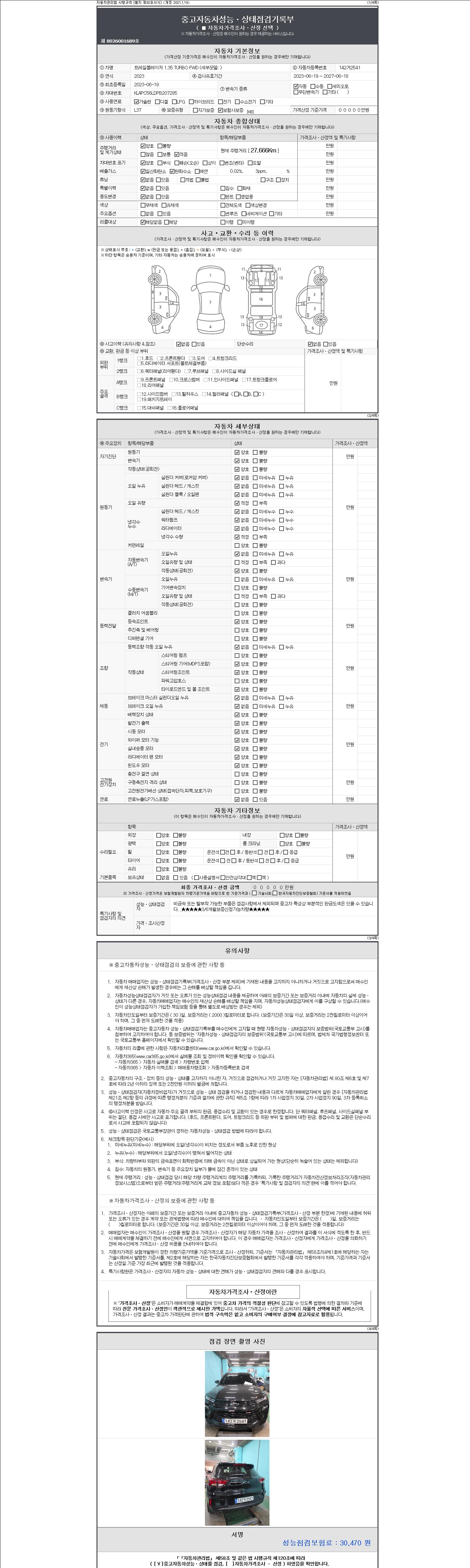 -중고자동차 매매업자를 통해 차량을 구입하실 경우 반드시 "중고자동차 성능, 상태점검 기록부"를 교뷰 받으셔야 하며, 매매업자는 반드시 의무 교부 하여야 압니다.